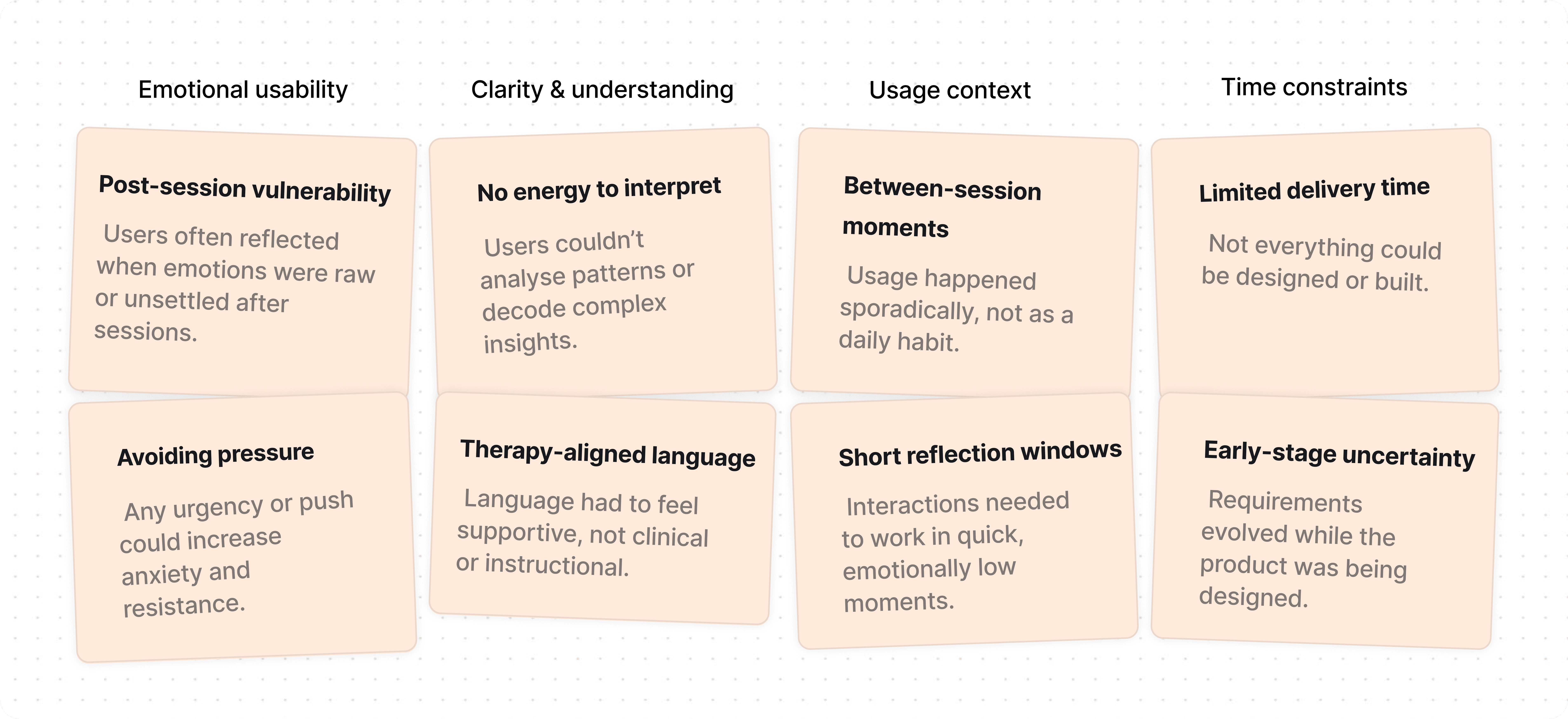 Calm over speed — Designed calm, forgiving interactions to support anxious and neurodivergent users, sacrificing some speed for clarity.