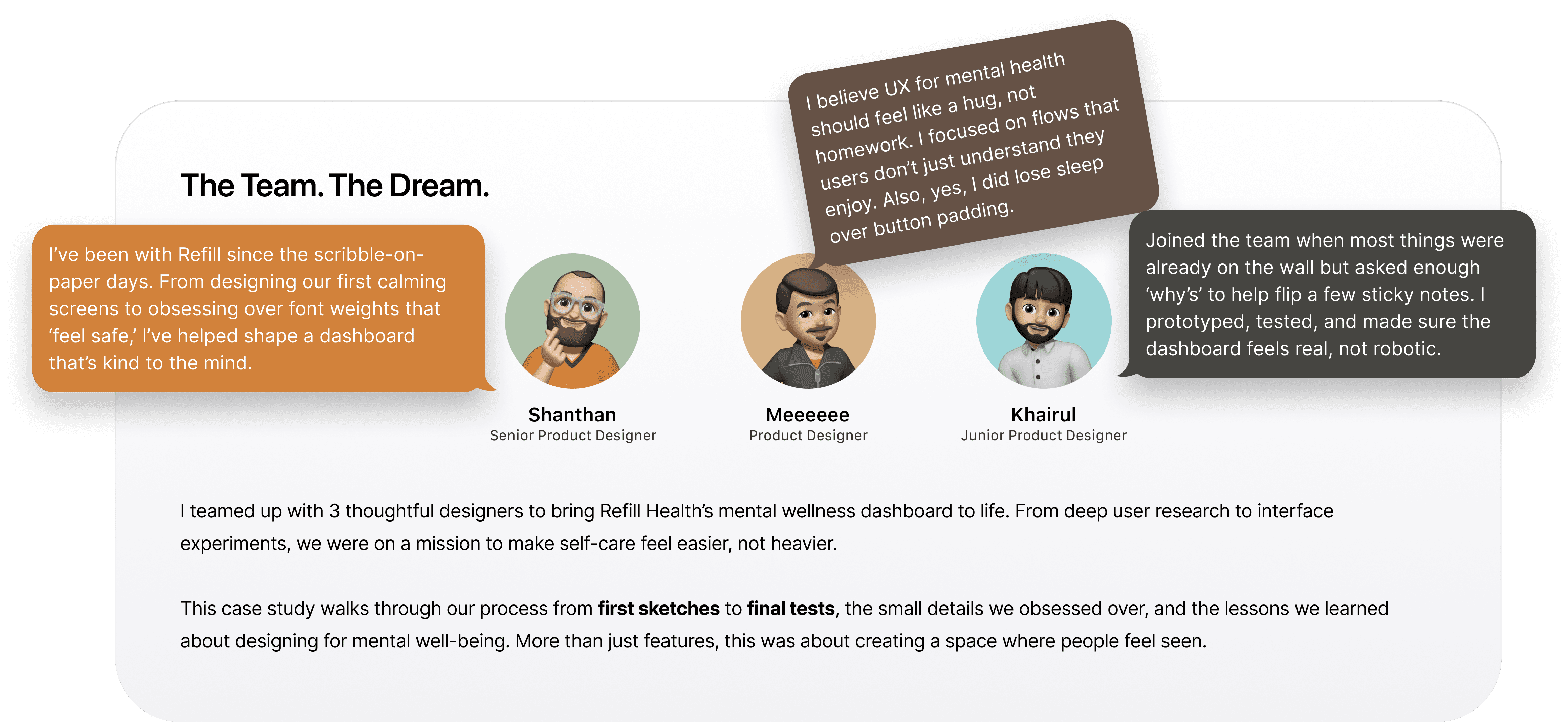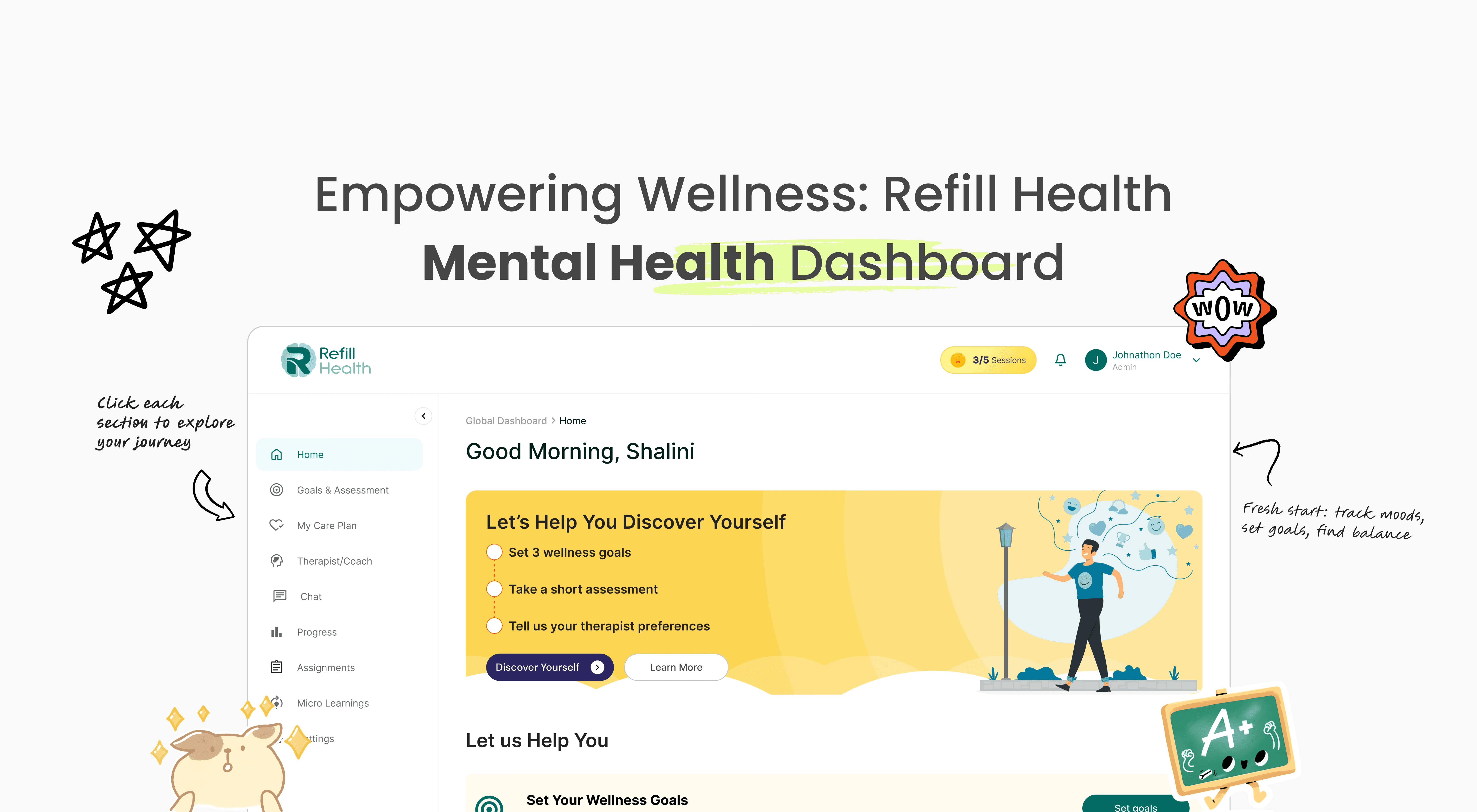 While creating the ReFil Health dashboard, we placed inclusivity at the center from day one, making sure each touchpoint feels safe, welcoming, and simple for people managing their mental health.